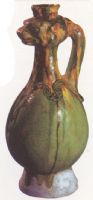 侈口,細(xì)長(zhǎng)頸,溜肩,鼓腹,平底,假圈足?谙滤塬F頭,輿肩上的蓮花形瑗柄形環(huán)柄相接成把手。器施綠釉為地,上施棕褐色及白色彩飾。