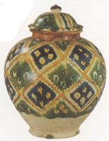此蓋罐腹部主題紋飾為褐色菱形紋,每一菱形內(nèi)用白色圓圈紋圍成邊框,內(nèi)繪藍(lán)地或綠地黃、白小花紋。彩釉施不到底。胎呈白色,釉彩斑駁艷麗。
