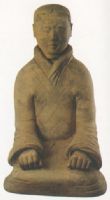 泥質灰陶,胎質堅固。此俑呈跪姿,腦後挽一高髻,圓臉,表情安詳。身穿交領長袍,寬肩寬袖,背部有彩繪,雙腿跪地,雙手放於兩膝之上。雕塑技法簡練,寫實性強,神態(tài)逼真,通過面部、姿態(tài)的精心塑造,刻劃出男僕俑恭順虔誠的性格,給人以強烈的藝術感染力,有較高的藝術價值。