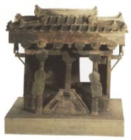泥質(zhì)灰陶。此屋是一大廳,建於座基之上。大廳頂為歇山式,簷為兩層相疊。大廳左右用兩立柱支撐,立柱上各掛一盾牌。中間較靠後位置還有一方形立柱,前方有臺(tái)階,可由此臺(tái)階從左右進(jìn)入大廳內(nèi),廳左右各設(shè)一小門。