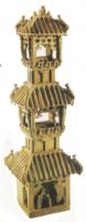 此鏤是三層四阿式方形建築。前為走廊,後為藏室,門前有“八”字形梯道,並立一守門人,下有四個(gè)長衣寬袖俑。陶樓的二、三層在腰簷上立方柱支撐平座,平座中央置有臥榻,四角用裸體人形柱。陶鏤各層均施雲(yún)形雀替和變形斗拱。通體施綠釉。