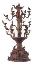 燈由座、盤、柱、盞組成。底座呈倒鉢形,上堆塑各類人物和多種動(dòng)物。座上為燈盤,盤口沿八個(gè)圓孔內(nèi)交替插入四柱燈盞和四枝羽人龍形飾。盤中心有一圓孔,燈柱插入燈盤內(nèi),燈柱上插有兩層羽人曲枝燈盞,燈柱頂端平塑一朱雀形燈盞,雀口含圓珠。通體施紅、黑等彩繪。