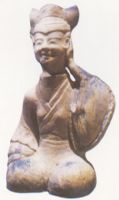 泥質(zhì)灰陶。俑為跪姿。頭梳高髻,雙目平視,面帶笑意。上身內(nèi)穿中衣,外罩禪衣。右手下垂,置於右腿上,左手撫耳後部。塑像安靜恬淡,似已陶醉在美妙的琴聲里。
