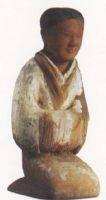 泥質灰陶。此俑呈坐姿,面部表情安祥和善。身穿交領長袍,寬袖,雙手攬於袖中,置於胸前。體施缸、黑彩。