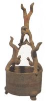 泥質(zhì)灰陶。三人倒立於陶樽之上。樽直口,深腹,三足。兩男子手握樽沿,相背倒立,一腿彎曲上伸,另一腿相交呈拱形,第三人倒立於兩人相交之腿上。俑身施紅彩。