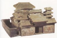 陶莊園由庭院和田圜兩大部分組成。庭院為三進(jìn)院落。門樓兩側(cè)有向?qū)ΨQ的三重薝四層角鏤。中庭的主題建築為二層樓閣。殿內(nèi)有六個(gè)伎樂俑,分別作彈琴、吹竿、拍手等動作,俑前置陶盤、耳杯等飲食器,應(yīng)為主人生前宴樂場所。中庭左側(cè)有糧倉。後院為廚房、廁所、豬圈等設(shè)施。此座陶莊園模型規(guī)模宏大,建築結(jié)構(gòu)嚴(yán)謹(jǐn),是當(dāng)時(shí)地主莊園經(jīng)濟(jì)發(fā)展的真實(shí)寫照。