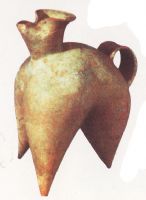 胎呈紅色,且夾細(xì)砂?谘赝鈷,在三分之一弧處向內(nèi)捏起,小端形成流,短見,鼓腹,腹下設(shè)三個(gè)大圓錐形袋足。腹部與口相對(duì)一側(cè)置帶狀環(huán)形鋬。