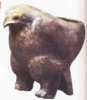 泥質(zhì)黑陶。器作鷹形,銳喙圓目,鷹身器腹,鷹足及尾為器足。此器出土於仰韶文化墓葬,器呈鷹狀,用極簡陋的雕刻技法刻劃出雄威巖的神態(tài),生動逼真,為原始陶塑藝術(shù)中的珍品。