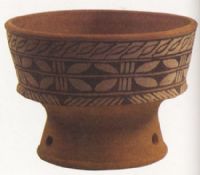 泥質(zhì)紅陶。斂口,深腹,喇叭形高圈足,上鏤空三個小圓孔。腹部凃白色為地,上飾黑彩繪成的樹葉紋及三道弦紋。    l