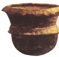 夾炭黑陶。斂口,折沿,粗頸,深腹,圜底。器身刻劃樹葉紋、水波紋等。河姆渡文化是長江下游地區(qū)重要的新石器文化。陶釜是河姆渡文化陶器中的典型器物。