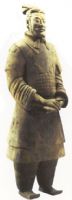 泥質(zhì)灰陶。此俑立於方形臺(tái)座之上。頭戴長(zhǎng)冠,長(zhǎng)方大臉,五官端正。身穿戰(zhàn)袍鎧甲,雙手疊於腹前,足穿方口翹頭鞋。此俑形體高大,身材魁梧,面容嚴(yán)肅,栩栩如生。