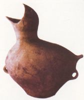 夾砂紅陶。器呈鳥形,昂首蹲立狀,像一嗷嗷待哺的雛鳥,伸頸張嘴,上有雙眼,鼓腹,短尾上翹,平底,腹兩側有一封弧形耳。頭、頸部飾帶狀黑彩。紅山文化彩陶紋飾多麴直線條、斜線條、三角形紋和菱形紋等。此器造型生動,新穎別致,圓渾飽滿,極富動感。
