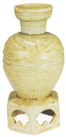 盂口,束頸,圓鼓腹,下置六方鏤空座。上腹部印花鳳凰紋,下置海水紋。此瓶紋樣清晰,造型美觀。惟胎釉欠佳。
