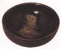 木葉紋裝飾是宋代吉州窰獨創(chuàng)。它是用經(jīng)過特殊處理的天然樹葉作紋樣,直接貼在瓷胎上敷釉燒制的,有半葉、一葉,也有二、三葉相疊成紋,經(jīng)制作者的匠心安排,無不自然質(zhì)樸,形象生勤。此碗貼一片樹葉,葉脈清晰,富有自然情趣,裝飾手法頗具特色。