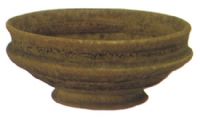 敞口,束頸,折腹,高圈足,口內(nèi)外、頸部均飾弦紋。體施青褐色釉,釉面有剝落現(xiàn)象。原始瓷缽始見於西周疇時(shí)期。此類器型出土較多,但多保存不好,或呈燮形。此鉢器形規(guī)整,完整無(wú)缺。器形常見。