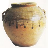 泥質(zhì)灰陶。直口,圓唇,短頸,溜肩,鼓腹,平底微凹。肩部貼塑羽紋暨繫一對(duì),上下分別用橫”S”形和環(huán)狀泥條裝飾,肩部飾三線凹弦紋兩組,間飾水波紋。上腹部施青黃釉,下腹無(wú)釉。