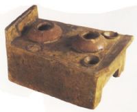 泥質(zhì)紅陶,上施黃釉。竈的平面為長(zhǎng)方形,中空,前端略寬,有長(zhǎng)方形落地火門,上有梯形擋火牆。竈面有二大二小四個(gè)火眼,在兩個(gè)大的眼上各置一釜。竈的後端有高約二點(diǎn)七厘米的竈牆,牆上塑出煙道。