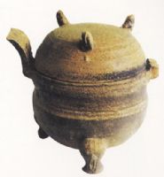 灰陶。子母口,深腹,平底,下腹飾獸蹄形三足?趦蓚(cè)附耳高翹,耳根突出,腹中部有凸棱。蓋滿釉,釉色青黃,器身上部施釉,大部分已脫落。