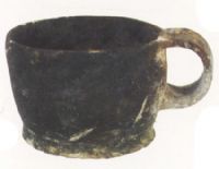 泥質(zhì)灰陶。斂口,筒形腹微鼓,圈足。腹部置一寬扁半圓形把柄。
