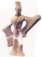 泥質(zhì)灰陶,表面施白色陶衣,上凃紅彩,頭身分製。頸部留出空心,後將頭部插入。舞俑頭戴小冠,身著右衽廣袖衫,下著長(zhǎng)裙,腰繫帶,衣衫和長(zhǎng)裙均凃紅彩。