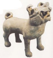 泥質(zhì)灰陶。狗為立姿,身體肥壯,短頸,尾上捲,四肢短粗,雙耳豎起,向前半垂。口大張,做吠叫狀。