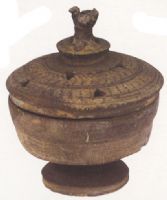 硬陶。直口,淺腹,短柄,圓餅足,有蓋,蓋面為三角形鏤空,蓋鈕立一鳥。