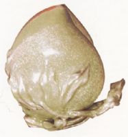 器呈桃形,頂尖處有小孔,為流。桃身一側(cè)堆貼桃枝、桃葉及雙桃,其中桃枝頂端開口作為進(jìn)水口。施天青釉,釉色熒潤(rùn),色渾明亮。此器為宜興燒造,不僅是一件精巧的文房用具,而且是難得的仿生工藝品。