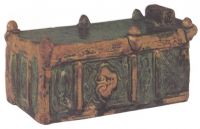 泥質(zhì)紅陶。脈呈長方形。通體施黃、綠色釉。狀面施綠釉,四邊有六個柱頭裝飾,一邊有枕。的牀邊沿施黃釉,四個側(cè)面為綠釉,其上凸雕海棠花冠、卷雲(yún)紋圖案以及黃釉支柱。