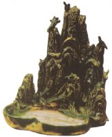胎呈白色。水池為海棠形,水池一邊堆塑一座高山,山峯高聾,山勢起伏陡峭,高低錯落有致,山間有雲(yún)朵和小鳥。小鳥有的在歇息,有的在池旁飲水。通體施綠、白、黃等釉彩,以綠釉為主。