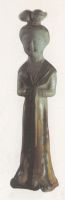 俑頭上梳束腰雙髻,面部豐潤,唇凃朱彩。上身穿白色袒胸褥衣,肩上披綠色披肩,下穿長裙。黃彩為底,上繪藍色寬條紋和白點花,裙角處露出雲(yún)頭鞋鞋尖。雙手置於胸前,隱在披肩後面,立於方形板上。
