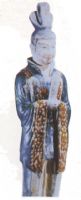 胎呈白色。此俑恭立於方座上。頭戴黑色梁冠,長方大臉,五官端正,面帶微笑。身著白色長襦衣,外套綠色寬袖短袍,袖飾寬邊黃、白花斑。足登翹頭靴,雙手執(zhí)牙笏拱於胸前。