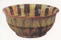 白胎。敞口,弧壁,腹中部有凸棱一道,圈足。內(nèi)外壁均以米黃色釉為地,外壁施黃、綠釉細(xì)條,內(nèi)外壁施綠色寬垂條紋和褐色細(xì)條紋。此器造型優(yōu)美,釉彩鮮麗,晶瑩潤澤,形成彩色斑斕的裝飾效果,顯示出三彩花釉之美,是三彩器中之佳作。