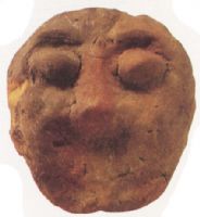 泥質(zhì)紅陶,手工捏塑。人面像呈扁圓形,額面低窄,眉脊隆起,眼球鼓出,顴骨較高,鼻扁且低,嘴下凹不甚明顯。背面作成不則的凹面,穿有未透孔的小鼻。此像形態(tài)憨厚,技法樸拙,是黃河下游地區(qū)罕見的原始陶塑人面像,為研究黃河流域原始人類形象提供了佐證。