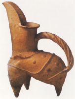 胎中夾砂。手工塑制,施有黃陶衣,壓磨光滑。島啄形流向上斜伸,直筒形頸,三袋足分襠而立。前兩足作封稱狀,後足特別肥大且向後伸,三足位置呈等腰三角形。頸下兩側(cè)飾附耳,袋足上飾曲綫狀附加堆紋,遍身貼附小圓餅飾。