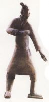 泥質(zhì)灰陶。此俑雙腳分立於長方形臺座之上。面部朝左,頭部頂右側(cè)捲起一高髻,雙目平視前方,身穿戰(zhàn)袍,足登戰(zhàn)靴,左腿前蹬,右腿後繃,雙手呈拉弓瞄準(zhǔn)立射狀。