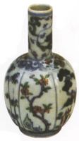直口,直頸,溜肩,瓜棱腹,淺圈足。圈足內(nèi)有“大清雍正年製”雙行楷書雙圈款。通體以淡描青花勾出紋飾輪廓線,再填以黃色,紅色,綠色彩料,紅色油嫩,綠色似水般瑩亮明澈。