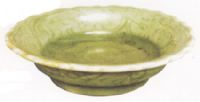 菱邊,仿龍泉豆青釉,內(nèi)用刻花技法,從底邊至上邊飾三朵展枝花卉。胎賞潔白,釉色瑩潤。