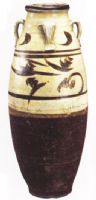 圓口,捲唇,長圓腹,平底微內(nèi)凹,近口處附四扁帶形繫。施白釉至腹中部,並用褐彩繪草葉紋,風(fēng)格粗狂,寫意生勤。