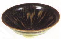 敞口,斜壁,矮圈足。胎質(zhì)粗鬆,胎色灰白。內(nèi)外施黑釉,外壁施釉不到底,器足露胎,釉釉質(zhì)肥厚,釉面光潤(rùn),黑釉上飾以醬色斑塊或醬色條狀紋,黑醬雨種釉色和諧自然,惹人喜愛。