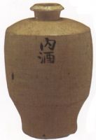 小口,捲唇,細頸,斜肩,長圓腹,下腹內收,平底微凹。胎體厚重,通體施白釉,器腹上部墨書內酒二字。此類小口長身器物,又名長瓶起腹書內瓶。