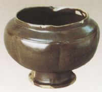 芒口,短頸,瓜棱形圓腹,高圈足外撇。胎體輕薄,胎色灰白,通體施醬釉,底足露胎,圈足外有漏釉現(xiàn)象,釉層稀薄,釉面滋潤細膩,從器物的口沿可以看到釉層的裹邊為黑色,時代及工藝特徵較為明確。定窯以燒白瓷為主,完整的醬釉器較為少見。
