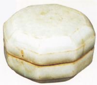 器呈八角形,子母口,平底。有蓋,蓋面刻割四葉花卉組成的錢幣紋,蓋輿器身有一個(gè)剔釉露胎的記號(hào),記號(hào)對(duì)齊,底和蓋則扣合緊密。底部印有“口家合子記”的戳記。施青白釉,釉層光潤。