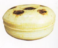 盒呈扁圓形,外飾數(shù)道弦紋呈竹節(jié)狀,蓋飾褐彩,美觀端莊。用褐彩裝飾瓷器始見於三國,盛行於兩晉,宋元亦常用之。瓷盒屬常見物,但出土於明確紀(jì)年的墓中。