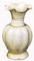 花瓣形口,直頸微撇,瓜棱形長圓腹,圈足外撇,裹外施釉;ò晷慰冢饕餍徐端未,各窯都有燒造。此瓶釉色白中泛黃青,明凈瑩澈,具有景德鎮(zhèn)窰的特點(diǎn)。