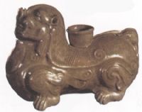 器呈獸形蹲坐狀,背設(shè)管狀進水口。獸的造型頗似獅子,體肥碩,中空,用以聹水。全身刻劃直線鬃毛,在鬃毛邊緣及四肢飾卷霎紋,尾部飾葉敘;野滋,胎質(zhì)較粗,青灰色釉,有細碎開片。此器是南方青瓷窯的產(chǎn)品,出土於北方地區(qū)。
