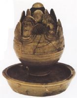 蓋峰山重疊狀,分為三層,每層五峰,交錯排列,峰後有十個鏤孔,為出煙用,圓頂上附蘑菇鈕,下為折沿平底承盤。胎為灰白色,捏外滿釉,釉色熒潤,呈青綠色。整體造型似大海中托起的山石,底盤則象徵大海。此器造型造型飽滿挺立,釉色熒潤均凈。出土時略殘。