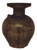 淺盤(pán)口,短徑,鼓腹下收。盤(pán)口外壁內(nèi)束,口沿飾對(duì)稱褐色點(diǎn)彩四處,並刻弦紋兩道。肩部到弦紋三道,並在近頸部分二道弦紋上堆塑一裝飾性小雞頭,尖嘴無(wú)孔,相對(duì)一側(cè)三角形雞角。另外兩側(cè)貼有兩個(gè)條形豎繫。施青黃釉,不及黃釉,不及底。釉層輕薄,並開(kāi)細(xì)碎紋片。