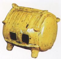 呈長鼓形,正面鏤兩個大小相同的方形孔及條狀臺面,是供雞出入之處。舍頂貼塑瓦檐,底置四個柱腳以隔潮瀑,反映了當(dāng)?shù)鬲毺氐牧?xí)俗。此器十分珍貴,較為少見。