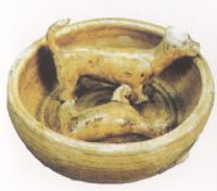 呈規(guī)整的圓缽形,內(nèi)塑雨雙小狗,一雙側(cè)身酣睡,另一雙翹尾、豎耳,雨眼盯視前方,似在精酣睡的小狗守銜,一動(dòng)一靜,形象生動(dòng)。內(nèi)外施青釉,呈炒米黃色。此器釉色,均佳,保存較好。