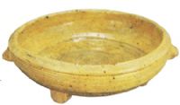 缽體為淺鼓腹,口沿處有雨乳突耳,底彀三矮足。內(nèi)外施釉,釉層均勻,呈米黃色。器內(nèi)外均飾凸弦紋,內(nèi)璧還加粗糙面,使用時內(nèi)裝物容易研碎。此器應為實用器。此器較為少見。